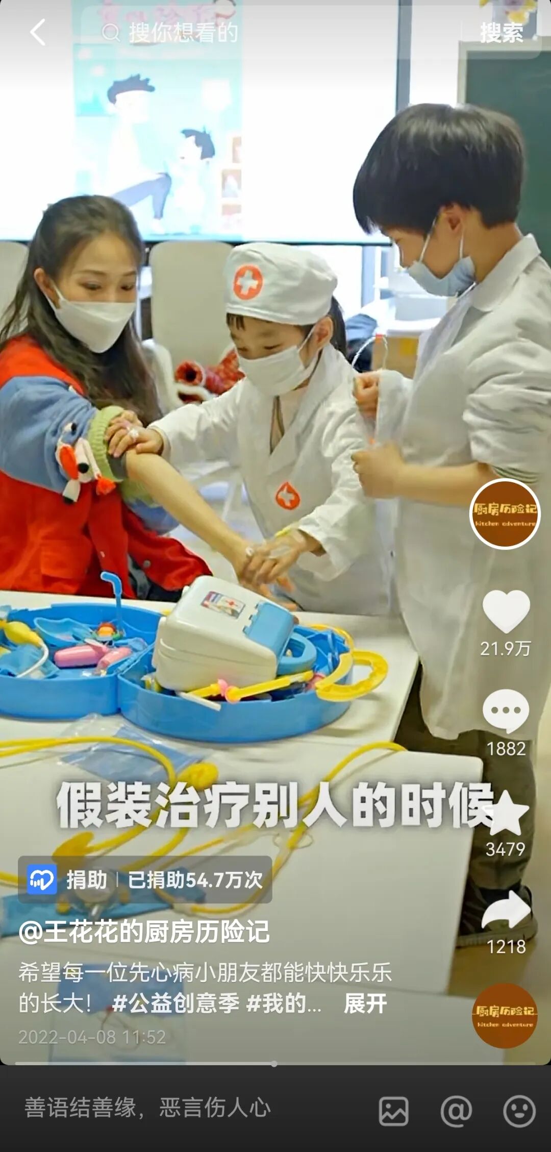 谈到发起公益专项的初衷,他说,自己从小也是一枚“吃货 ”,所以能够理解营养午餐对孩子们成长的重要性。因此每次拍摄公益行动的视频,都是他发自于内心的真实记录。在两期爱心厨房的视频结尾,他都鼓励孩子们:“要记得你们得到大家的帮助,是因为你们可爱、善良,吃好喝好,去成为你想成为的人!”这是给孩子们的祝福,也是给网友们的感谢。