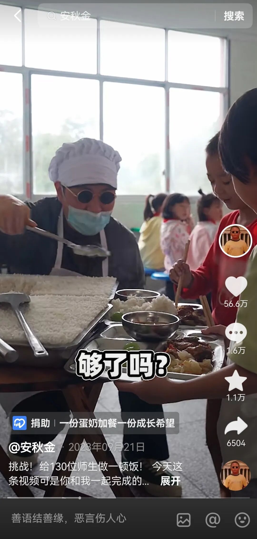 除了为乡村儿童掌勺,安秋金还把厨艺互动融入到了更多的公益内容中。在黄习老师创办的贵阳孤独症托养机构里,他和孩子们一起到菜场买菜做饭,一起唱跳玩闹,为“撑起特需孩子的尊严”孤独症公益项目提供筹款支持。视频共收获20余万次赞,网友们在评论区也纷纷附上自己的捐款截图,身体力行回应他的倡导。