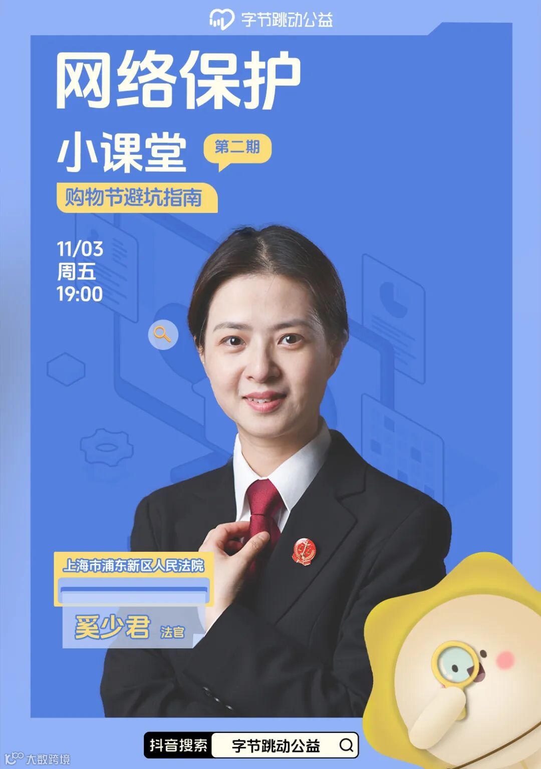 网络购物和网络消费场景中的骗局频发,我们也针对即将到来的购物节准备好了一份防诈骗指南,邀请您和孩子一起守护好自己的财产安全。在明天字节跳动公益与上海市浦东新区人民法院共同发起的专题直播中,我们将邀请来自上海市浦东新区人民法院的奚少君法官做客直播间,通过丰富的案例和理论知识帮助大家了解如何防范与网络消费相关的骗局,引导家长为孩子建立良好的消费观,并对近期发布的《未成年人网络保护条例(草案)》中相关内容进行详细解读。
