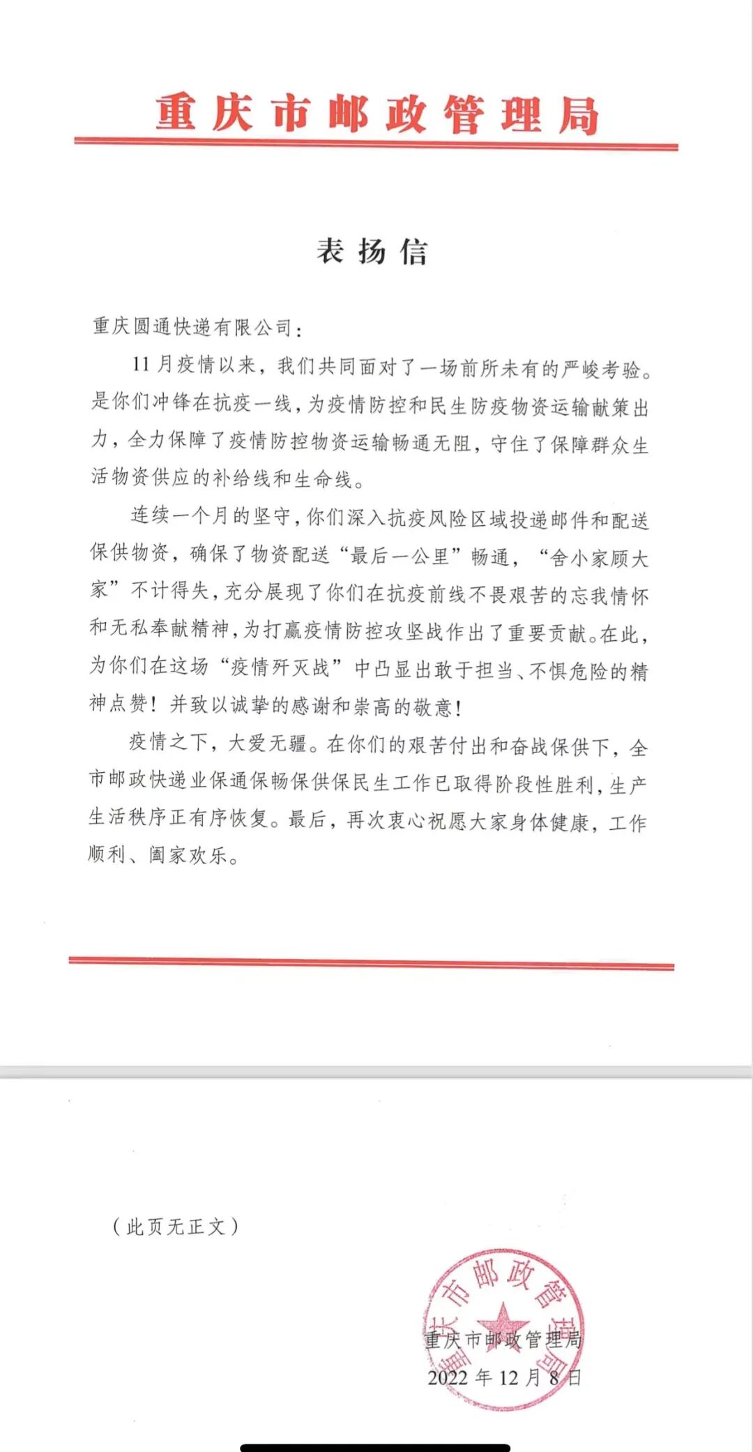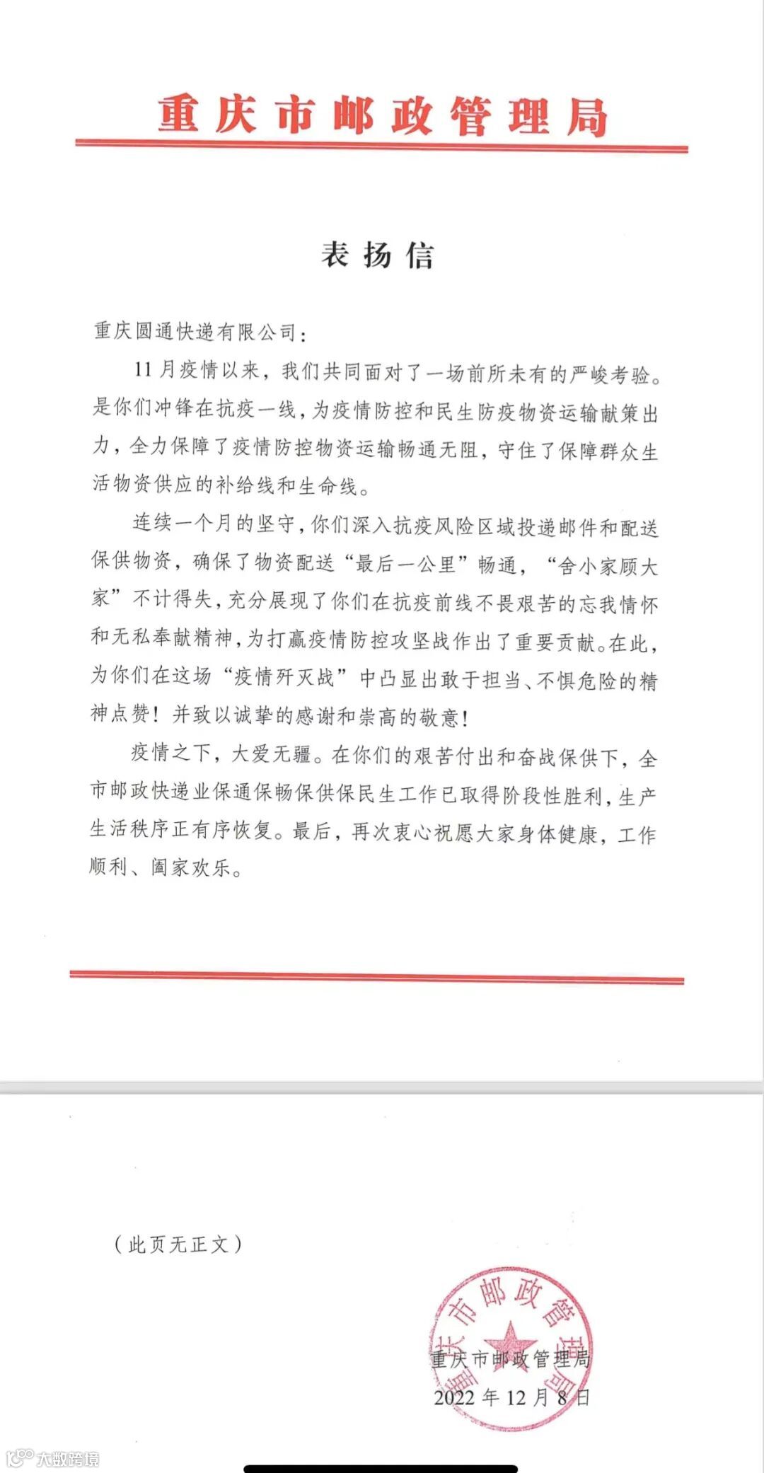 近日,圆通速递重庆省区(以下简称“重庆圆通”)收到重庆市邮政管理局发来的表扬信。信中对重庆圆通在重庆疫情期间快速响应、主动担当,不惧危险地深入疫情风险区域投递快件、配送民生保供物资的付出与奉献表达敬意,对其为保障全市邮政快递行业保通保畅保供民生工作取得阶段性胜利,生产生活秩序的有序恢复所做出的努力表示感谢。