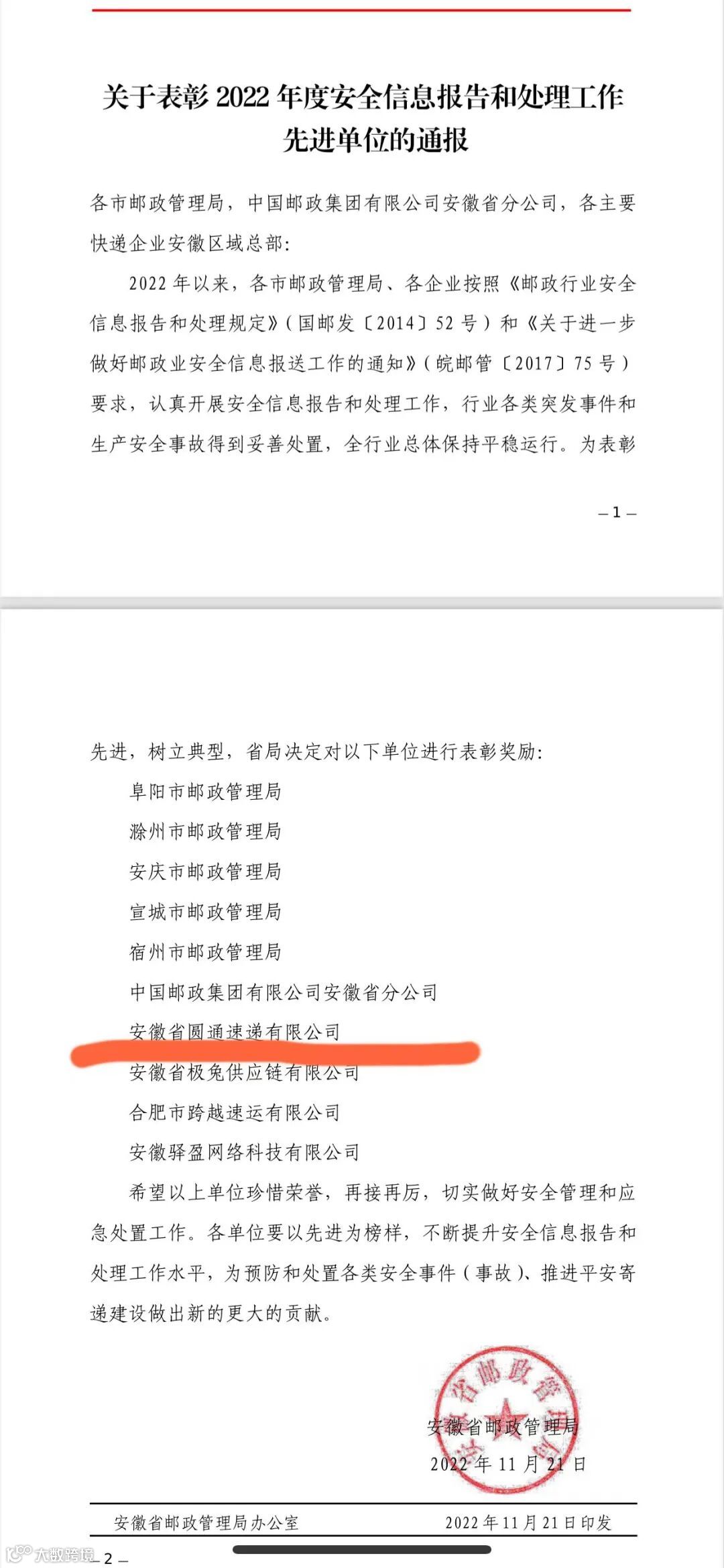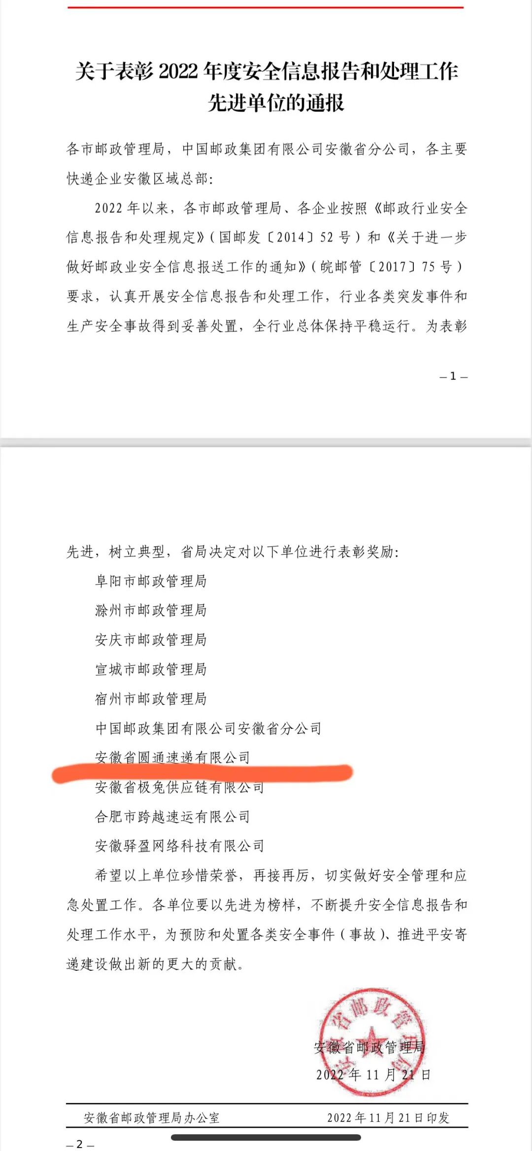 近日,圆通速递安徽省区(以下简称“安徽圆通”)收到安徽省邮政管理局的表彰函,对其2022年度在安全信息报告和处理工作上的突出表现及为平安寄递建设做出的贡献进行表扬,并号召全省邮政快递行业向先进学习,再接再厉,切实做好安全管理和应急处置工作。