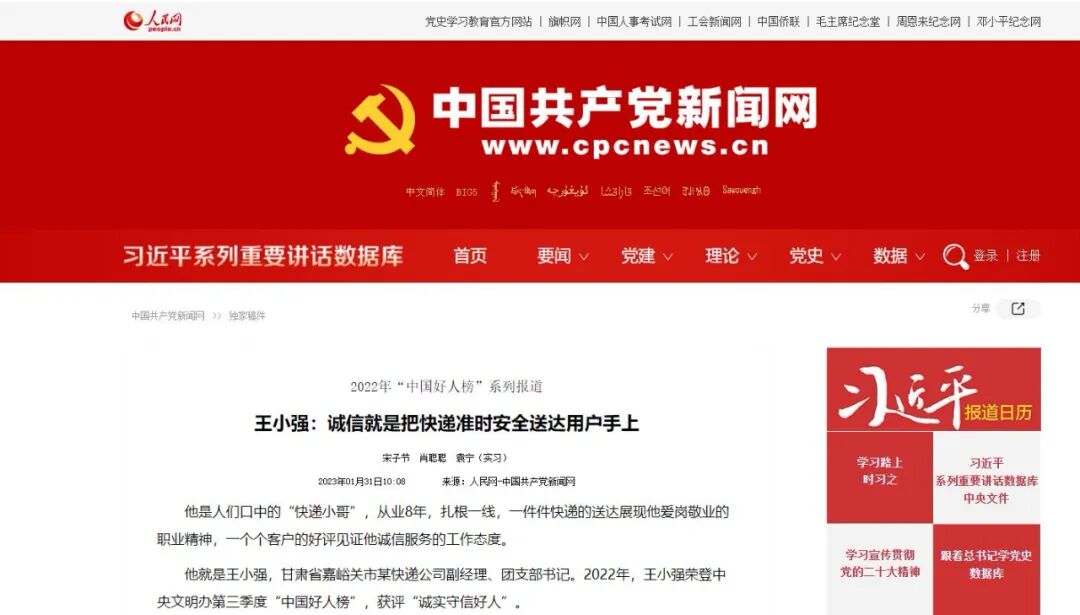 1月31日,人民网-中国共产党新闻网刊发了圆通甘肃嘉峪关分公司副经理、团支部书记王小强扎根一线、爱岗敬业、诚信服务的典型事迹。2022年,王小强荣登中央文明办第三季度“中国好人榜”,获评“诚实守信好人”。