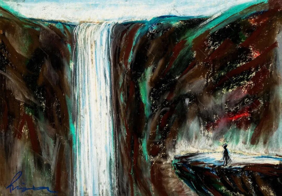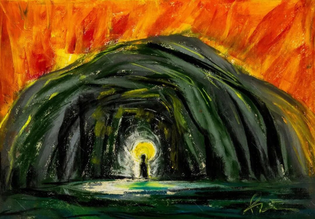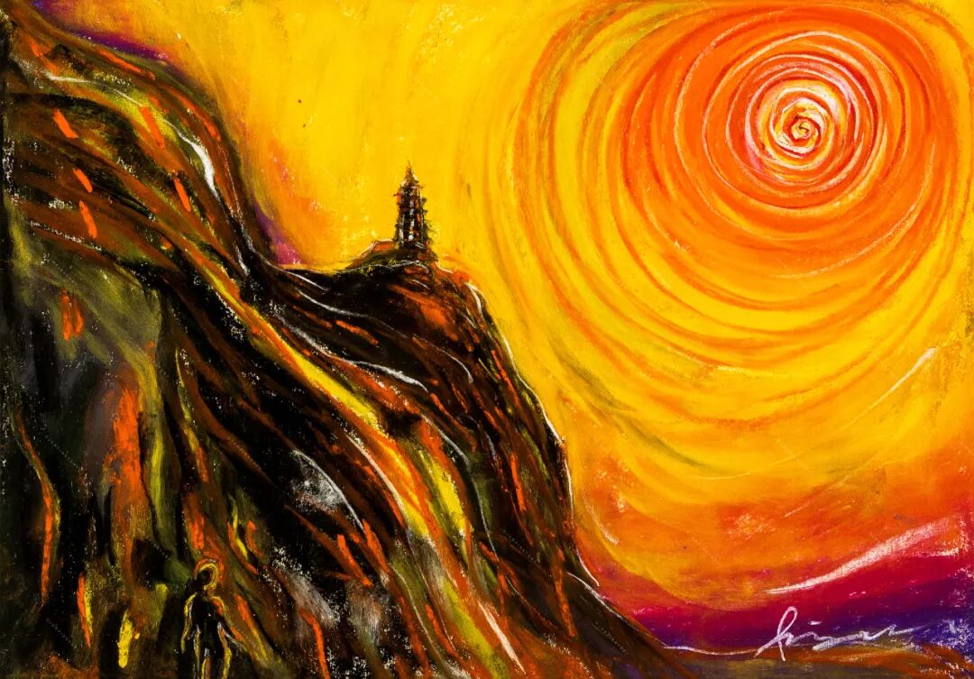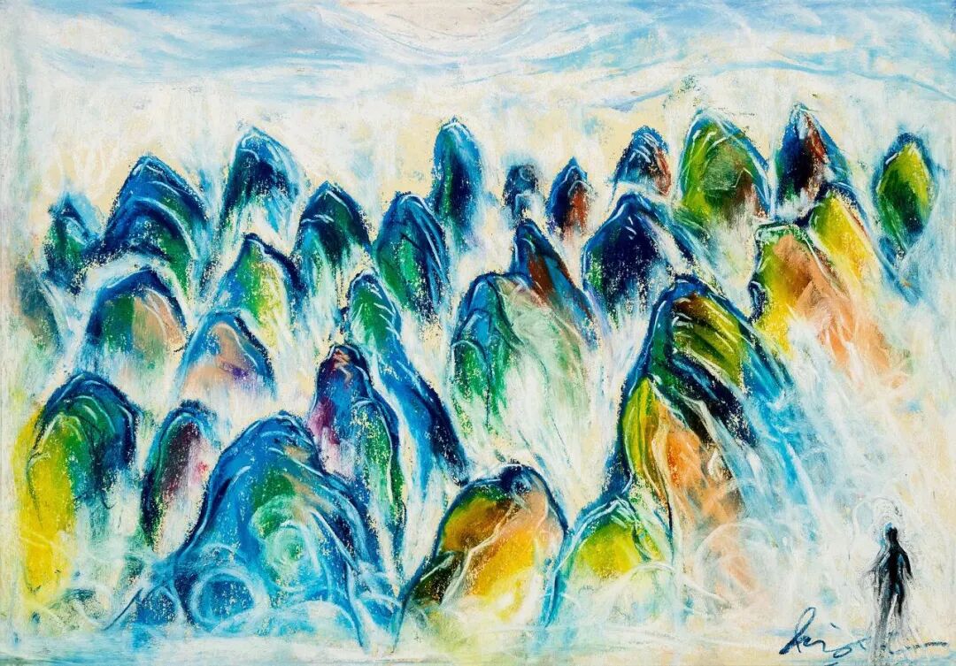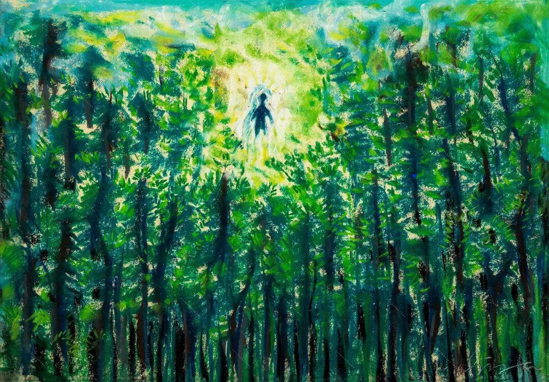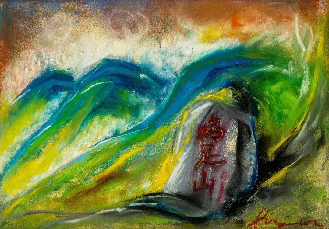 创作鸡足山的画时,他先在纸上画色粉画,再扫描成电子版。他以前试验过,虽然这样后期制作更麻烦,但最终质感比直接在电脑上画更好。