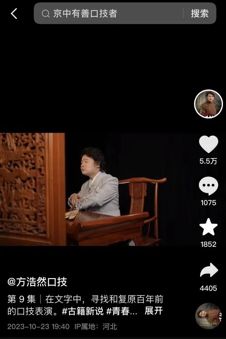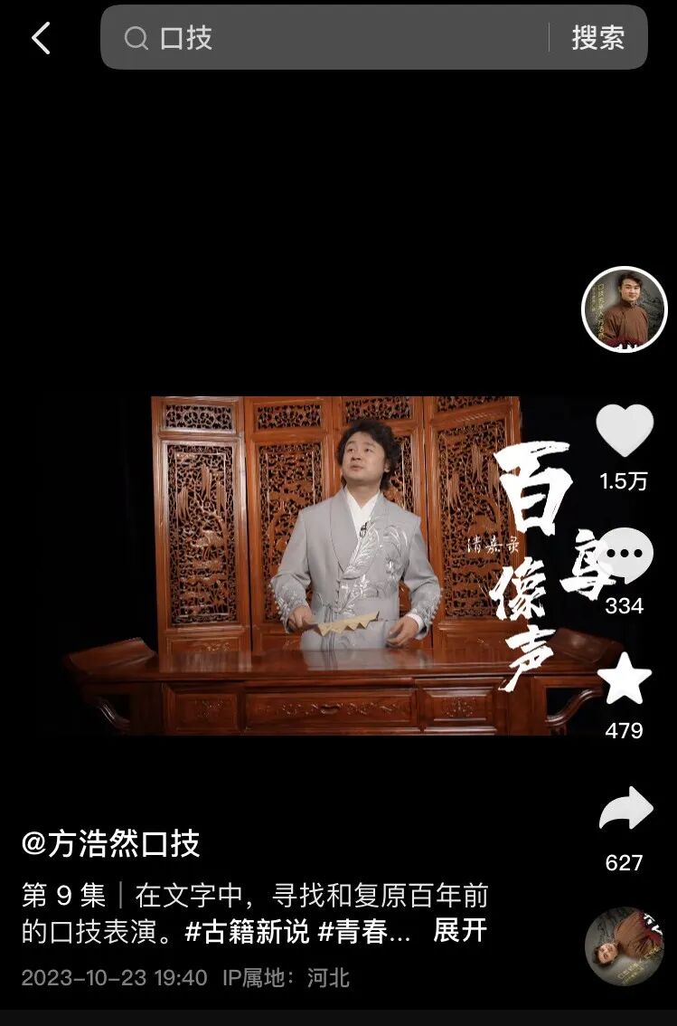 当然,屏风的后面什么也没有,只有抖音创作者@方浩然口技 端坐着。这是他用口技完成的一段表演。今年8月,他报名参加了“识典杯·古籍内容创意季”,认定这是一个很好的展示口技的途径。