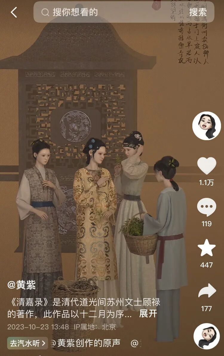 抖音创作者@黄紫 得知要举办“识典杯·古籍内容创意季”时,特别高兴,“主办方策划这个比赛的目的与我一直以来的期望不谋而合”。
