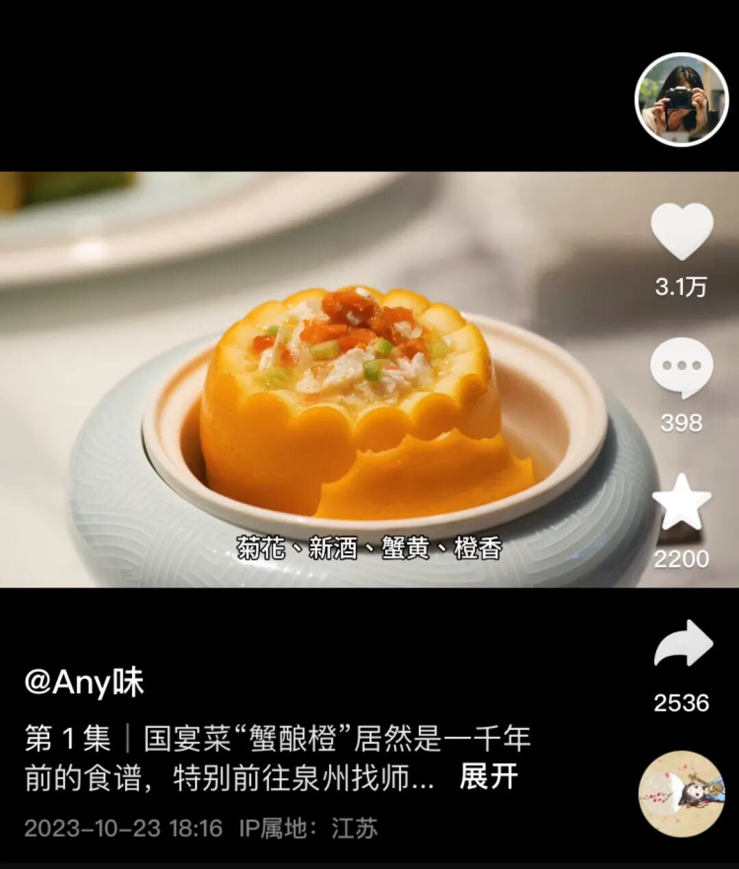 Any味决定拍摄《山家清供》来参赛,她去了林洪家乡泉州,和那里的大厨沟通,希望能最真实地还原。有一道菜叫蟹酿橙,可能是这本书里最出名的菜肴了,流传至今,还上过国宴。复刻这道菜最难的是选择橙子品种,因为螃蟹和橙子搭在一起的味道很难想象,她想知道古人为什么会做这样的选择?
