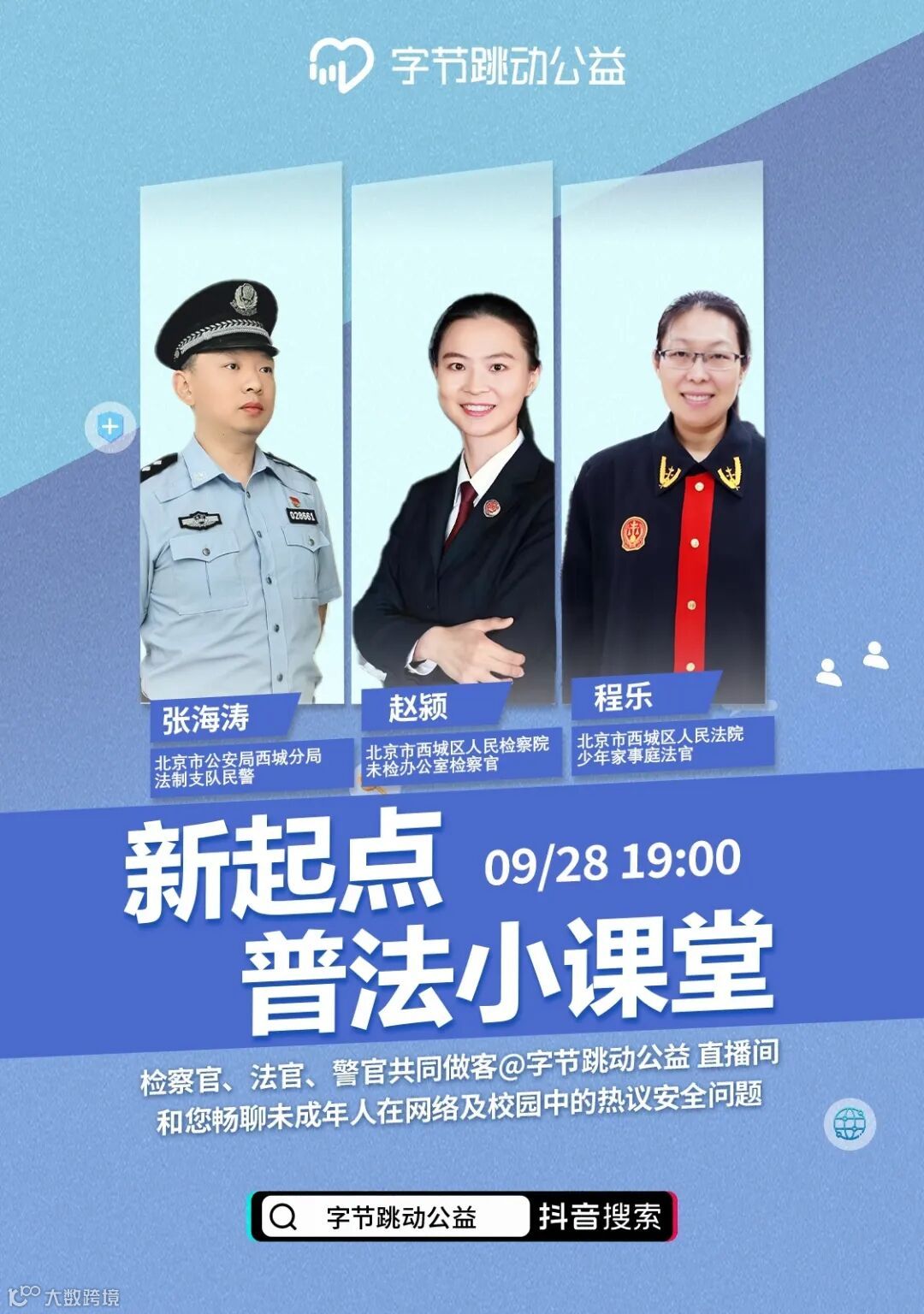 为此,字节跳动公益与北京市西城区人民检察院共同发起“新起点普法小课堂”,邀请北京市西城区人民检察院未检办公室检察官赵颍、北京市西城区人民法院少年家事庭法官程乐、北京市公安局西城分局法制支队民警张海涛做客直播间,为家长和青少年朋友们带来“青少年安全第一课”。直播将以一些常见的校园伤害及网络侵权案件为基础,通过挖掘背后的犯罪原因以及自护要点,为观众朋友们答疑解惑。