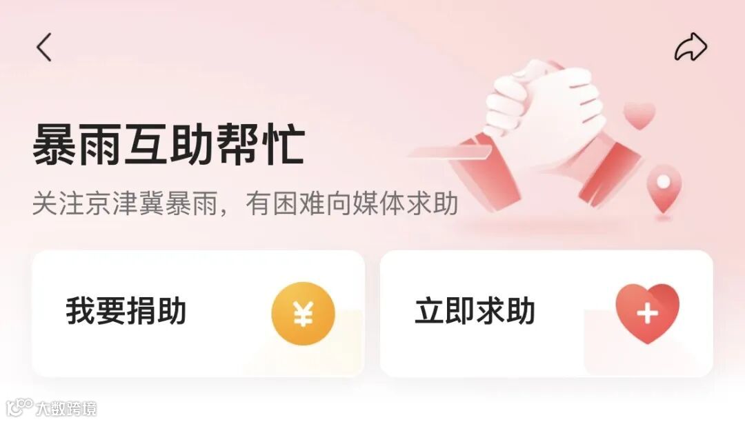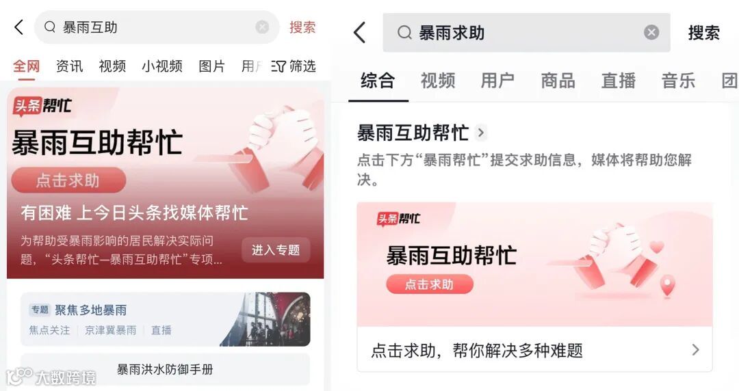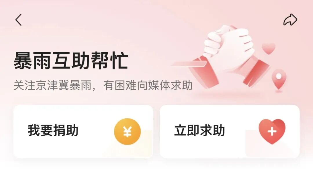 为了帮助因汛情受困的人们,今日头条、抖音、字节跳动公益平台联合北京日报、河北新闻网、燕赵都市报、纵览新闻客户端,开通#暴雨互助帮忙#通道。打开今日头条或抖音APP,搜索“暴雨互助”,即可找到通道入口。