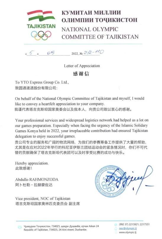 “贵公司专业的服务和广阔的物流网络,为我们的参赛筹备工作提供了大量的帮助,尤其是在应对2022年举行的科尼亚伊斯兰团结运动会的紧急情况时,你们不可替代的贡献确保了塔吉克斯坦代表团可以及时享受比赛的成功与快乐。”结尾署名来自塔吉克斯坦国家奥委会副主席拉赫蒙佐达,这位曾经的冠军运动员在信中给予了圆通速递的物流服务高度肯定。