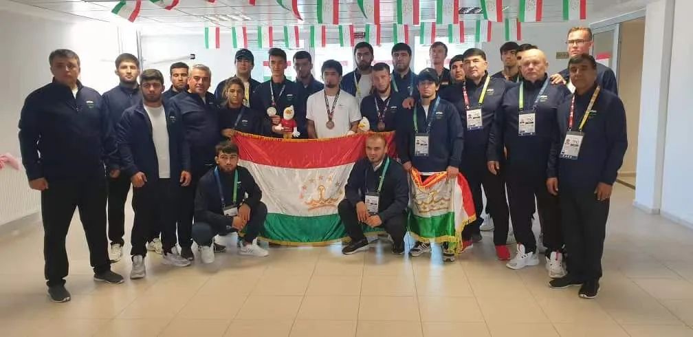 塔吉克斯坦国家队员身着参赛服装留影纪念