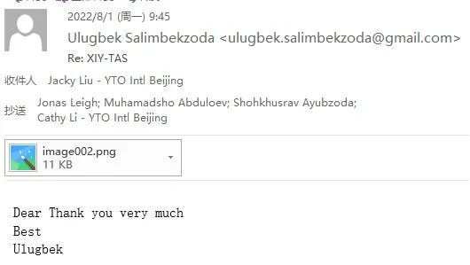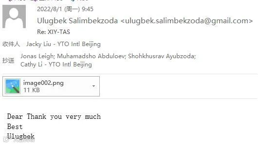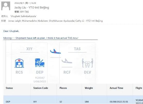 在圆通国际的整体协调下,杜尚别、塔什干、乌鲁木齐、西安、北京的物流齿轮开始联动起来,7月28日晚间22时货物从乌鲁木齐退关后空运至西安;7月29日一早,西安站点正式提货筹备报关材料;赶在7月30日周五下班前最后一刻,刘平收到了海关放行的通知。