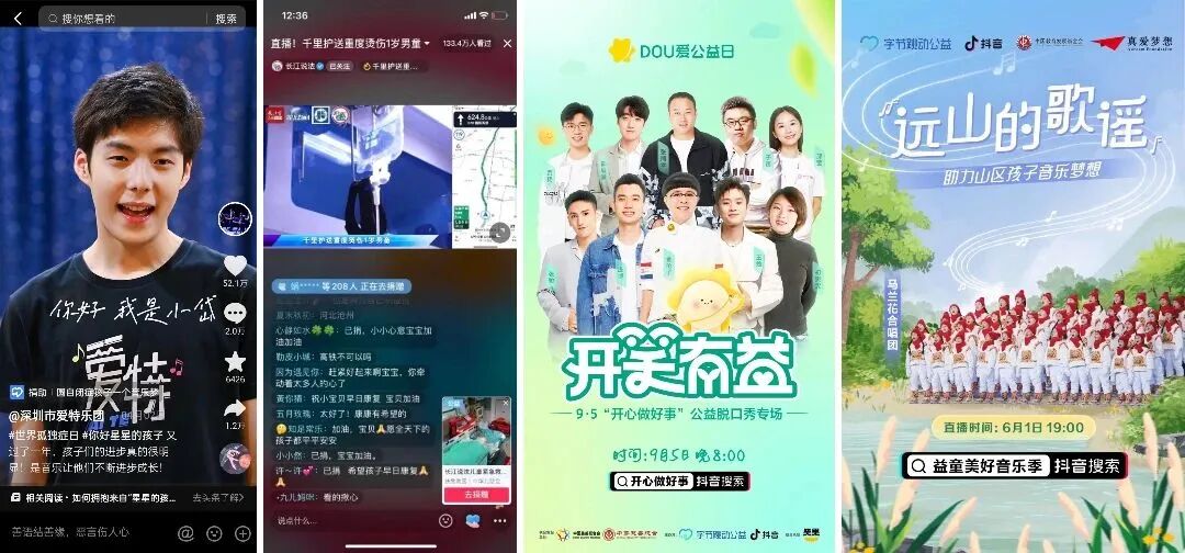 @深圳市爱特乐团 在抖音进行了孤独症儿童直播演出,让更多人看到这群星星的孩子;千万网友在抖音直播共同见证了一场生命的接力,为烫伤男孩“小康康”祈福、捐赠善款;在「DOU爱公益日」活动中,携手笑果文化策划了一场公益直播脱口秀,号召大家一起开心做好事;上线「益童美好音乐季」公益活动,让更多用户关注山区孩子的美育培养..……