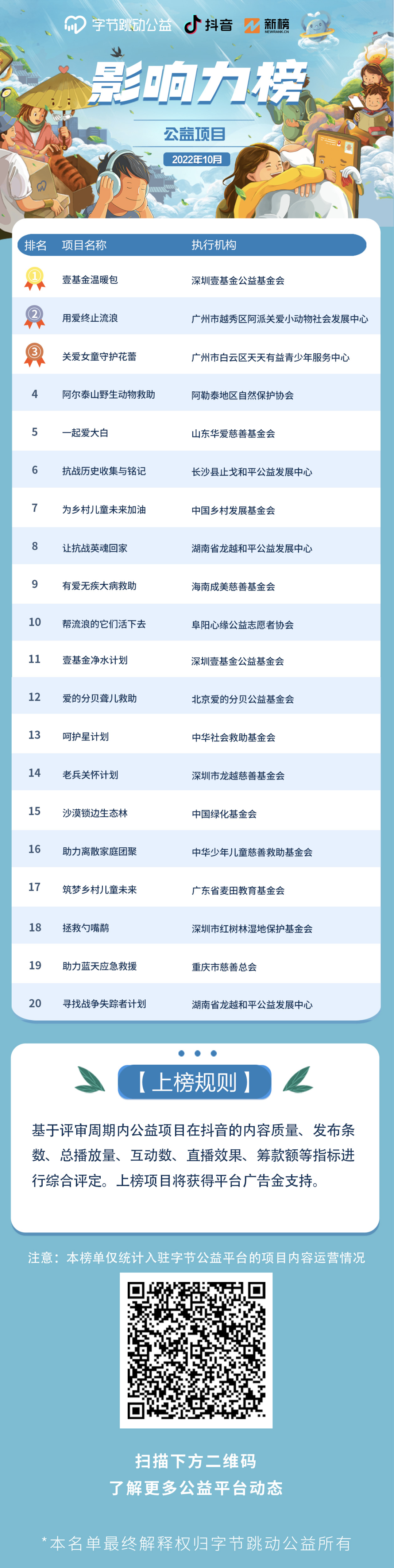 字节跳动公益平台和新榜联合发布“字节跳动公益平台公益项目影响力排行榜”。今日发布10月榜单,本次榜单统计周期为2022年10月1日到10月31日。
