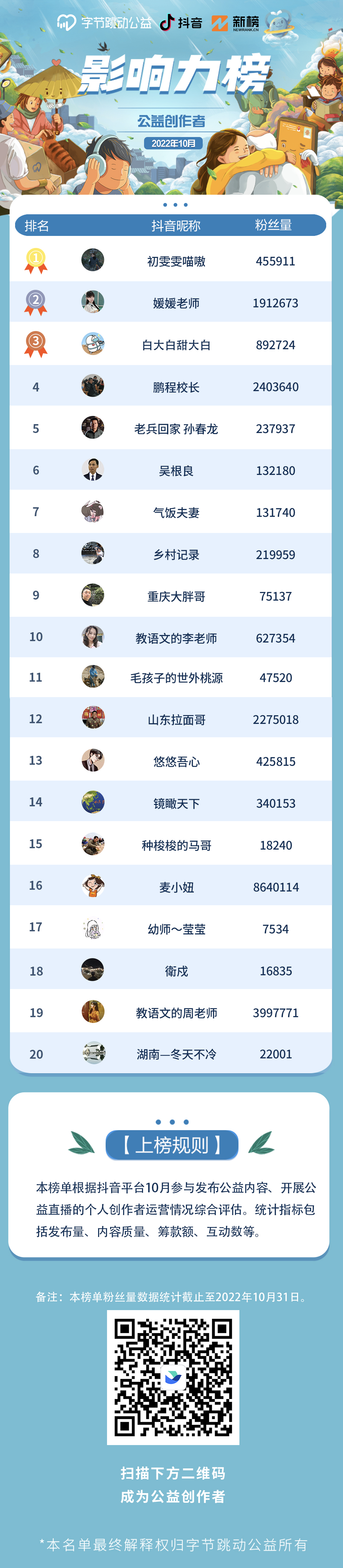 字节跳动公益平台和新榜联合发布“字节跳动公益平台公益创作者影响力排行榜”。今日发布10月榜单,本次榜单统计周期为2022年10月1日到10月31日。