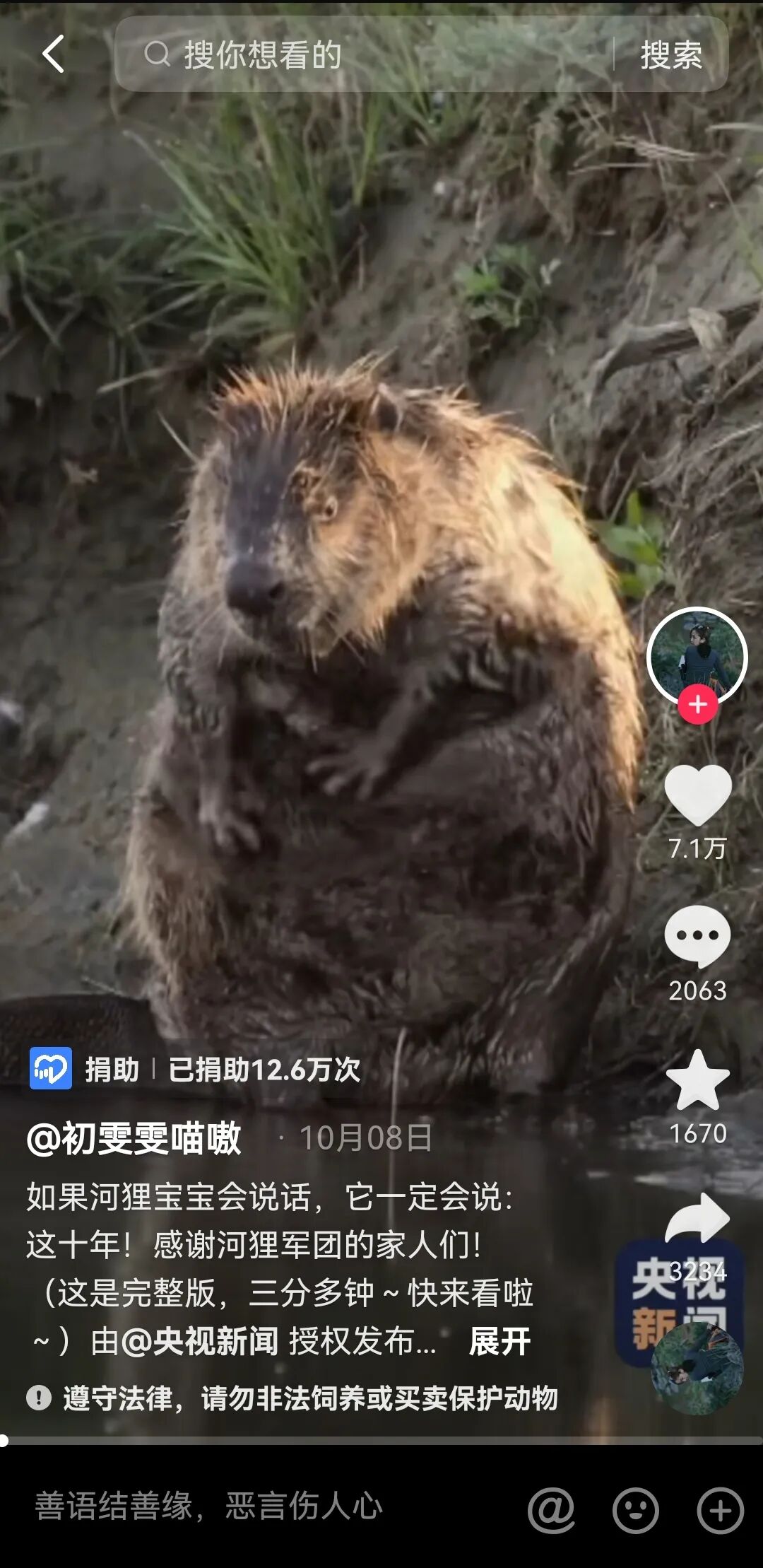 其中,新疆阿勒泰地区自然保护协会会长、“河狸公主”初雯雯就是活跃在抖音上的动物保护工作者,她在抖音拥有近60万粉丝。作为90后的她扎根新疆阿勒泰,守护当地以蒙新河狸为代表的珍稀动物,为河狸建巢穴、修“食堂”,帮助种群恢复适宜的生活环境。
