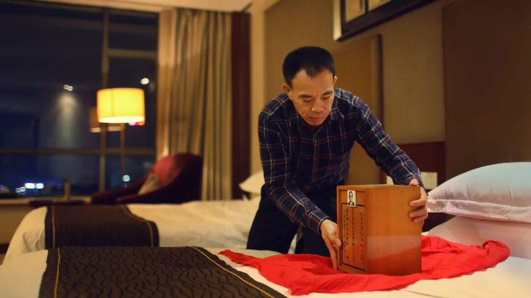 每次背老兵回家,他都会用一张90厘米见方的红绸布包住骨灰坛,他说“送老兵回家,这是在办喜事”。