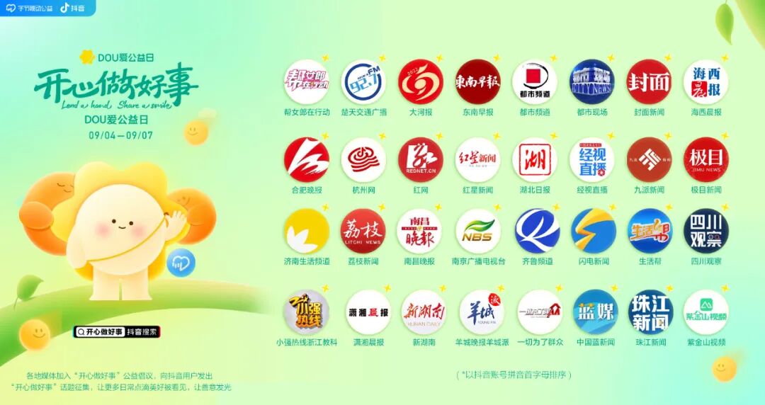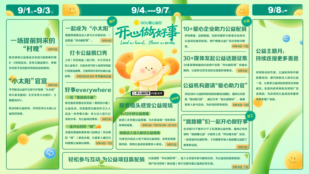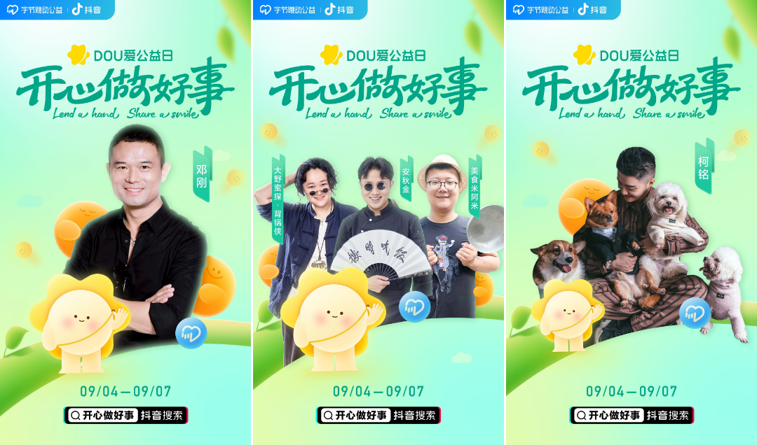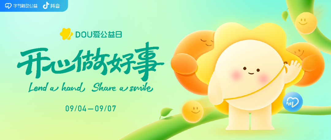 9月4日至7日,大家在抖音搜索“开心做好事”,即可进入主会场,通过关注、转发、分享、参与公益任务,为支持的公益项目赢取配捐,或直接捐赠。