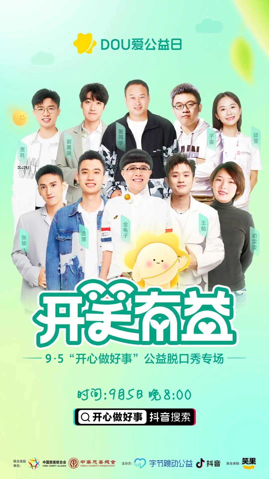 9月5日晚20:00,我们将联合中国慈善联合会、中华慈善总会开启「开笑有益」脱口秀,著名少儿节目主持人金龟子、抖音乡村守护人张同学和笑果文化「公益笑友团」庞博、王勉等将用脱口秀分享开心做公益的故事。