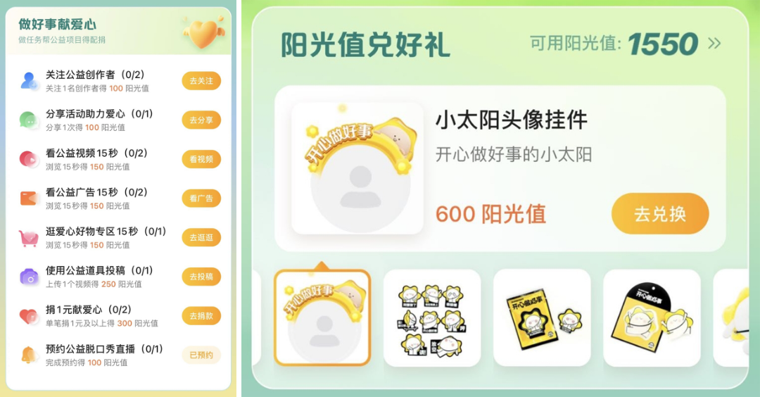 每个参与主会场活动的爱心伙伴,都可以获得“阳光值”,用于兑换专属公益周边等礼物。