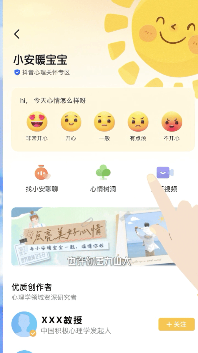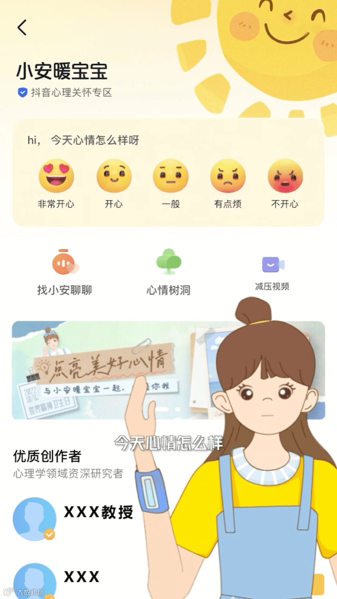 它有四个主要功能,点亮心情、找小安聊聊、心情树洞和解压视频。