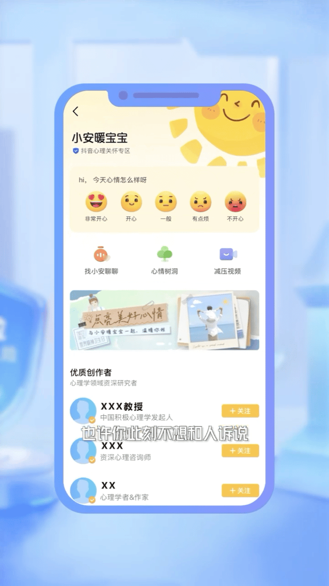 小安暖宝宝是抖音心理关怀小助手。2022年10月,抖音安全联合字节跳动公益、字节跳动人工智能实验室(AI Lab)推出“小安暖宝宝”,从咨询、倾诉、专题内容学习等多维度给予用户心理调节方法,帮助其缓解负向情绪。