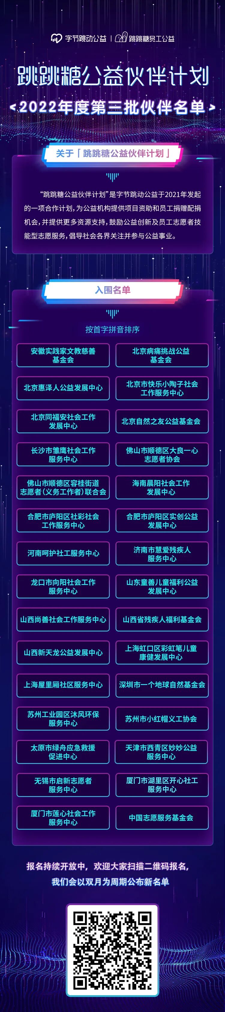 各位公益伙伴,经过一段时间的报名和筛选工作,跳跳糖公益伙伴计划2022年度第三批伙伴名单已经新鲜出炉,共30家机构入围。