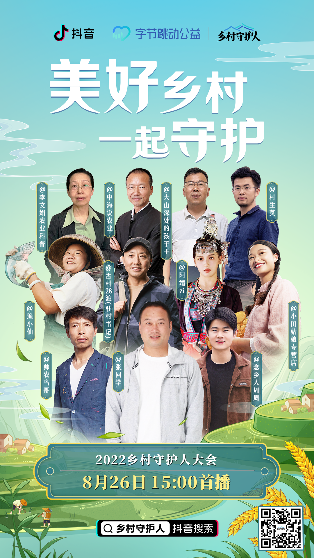 大会当天,@字节跳动公益、@乡村守护人 抖音账号将和@张同学 @帅农鸟哥 @念乡人周周 等乡村守护人一起,全程直播,分享自己助力乡村发展的真实故事。