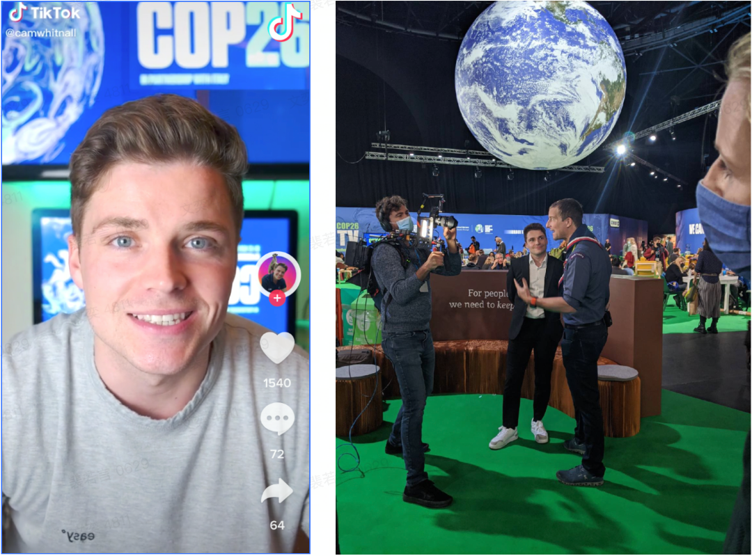 环保创作者Cam Whitnal,被联合国大会选为官方大使,这也是TikTok创作者首次被联合国大会选为官方大使。他与另外一名环保内容创作者Solona前往了COP26会场,通过TikTok为全球用户现场直播,吸引了12.6万名观众参加互动。