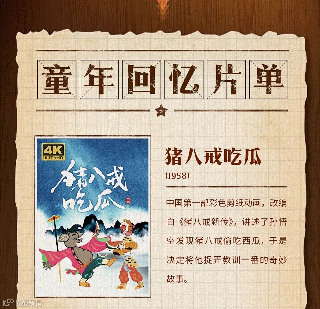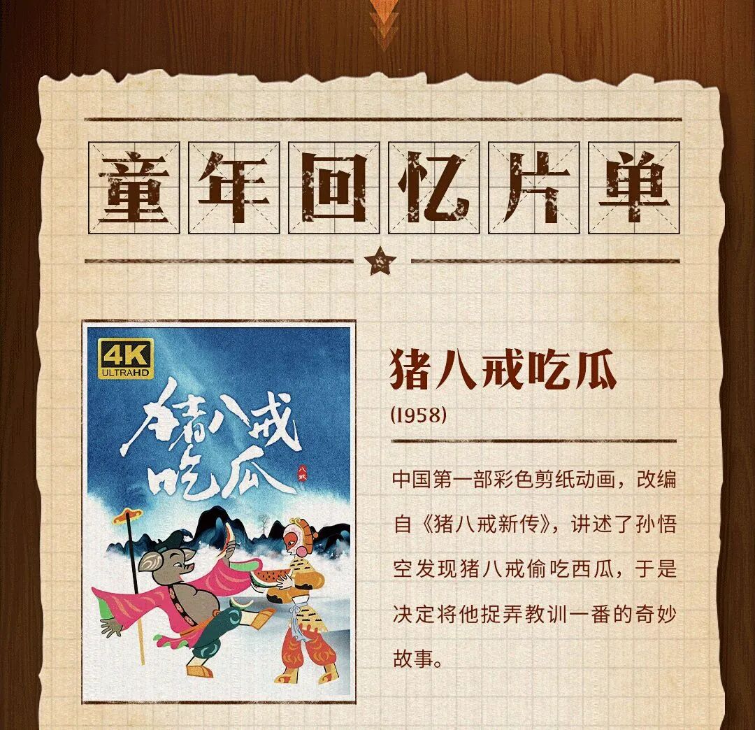 1958年,中国第一部彩色剪纸片《猪八戒吃瓜》一举成功。这部动画改编自《猪八戒新传》,讲述了猪八戒偷吃西瓜,被孙悟空捉弄的故事。原片噪声、划痕较多,在修复之后,展现出丰富的色彩和细腻的人物场景。