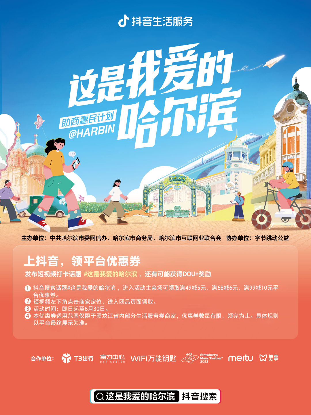 由抖音生活服务发起,中共哈尔滨市委网信办、哈尔滨市商务局、哈尔滨市互联网业联合会主办,字节跳动公益协办,T3出行哈尔滨、WiFi万能钥匙、哈尔滨富力中心、美图美事合作支持的“助商惠民计划”之“这是我爱的哈尔滨”活动在哈尔滨落地启动。即日起至6月30日,抖音生活服务将通过向哈尔滨区域内商家提供多样化经营支持,帮助商家尽快恢复生产,缓解经营压力,挖掘全新发展机遇,促进哈尔滨消费复苏。