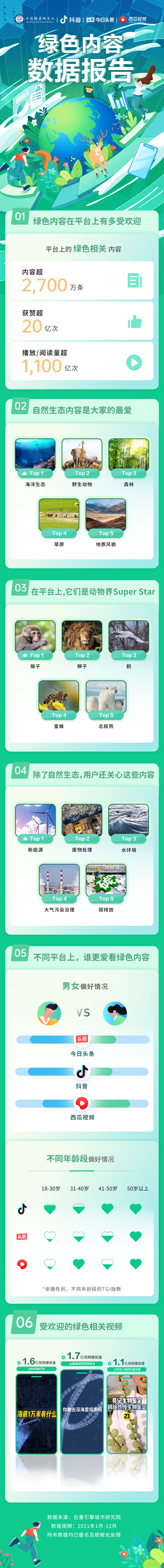 大自然相关内容,在平台上究竟有多受欢迎?《绿色内容数据报告》显示,相关内容在今日头条、抖音、西瓜视频平台的播放/阅读量超过1100亿次,点赞量超过20亿次。我们欣喜地看到,今日头条、抖音、西瓜视频平台不仅是大众关注自然、了解自然的窗口,也逐步成为助力自然科普教育、推广绿色发展理念的工具。
