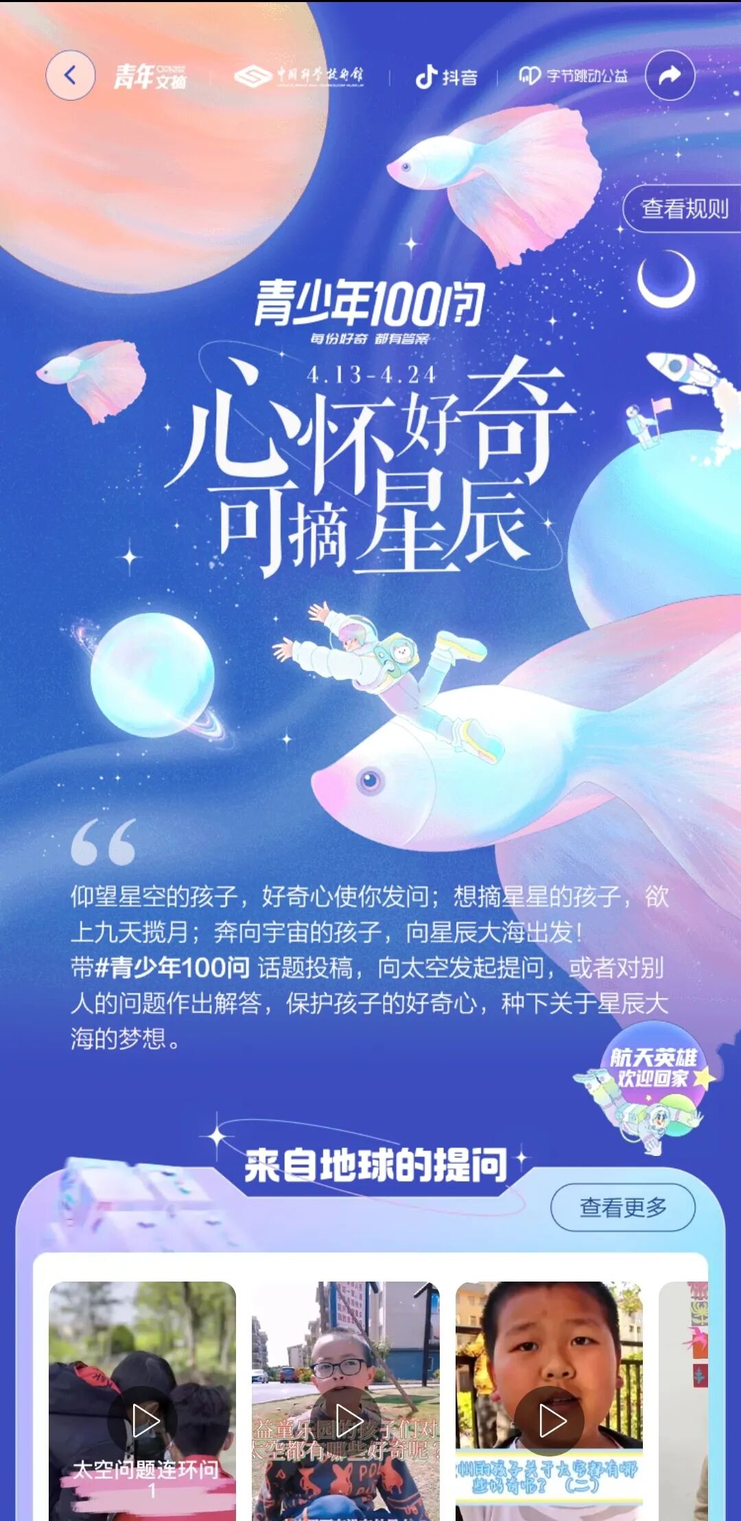 4月13日至4月24日,中国科学技术馆、字节跳动公益、抖音联合发起的青少年100问第二季再次上线。活动以“心怀好奇,可摘星辰”为主题,将聚焦星辰大海,为孩子们分享科普知识与航天精神。