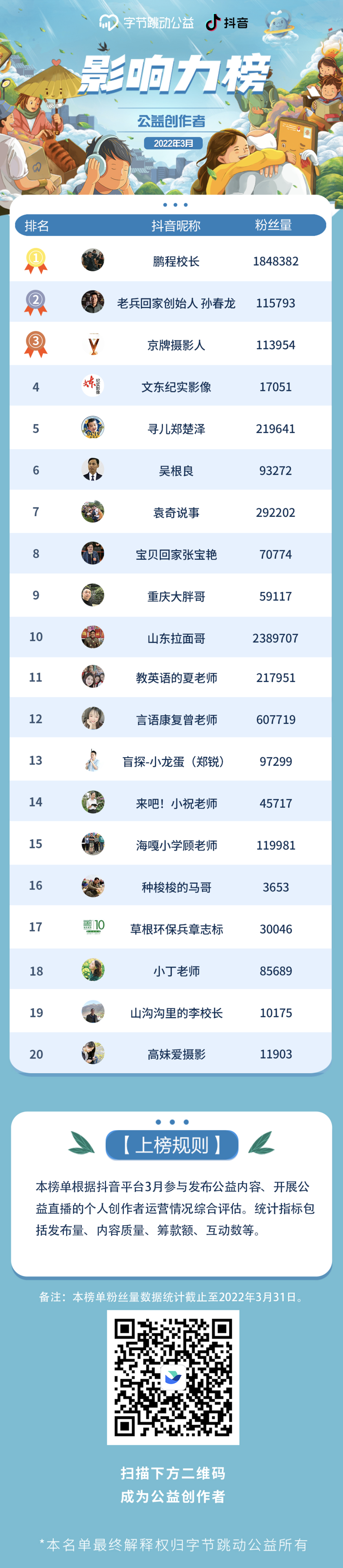 本榜单为盘点与鼓励在抖音平台表现优异的公益创作者账号而设立。主要根据每月在字节内容平台的多项数据指标综合统计。本次共计评选20位公益个人创作者上榜。