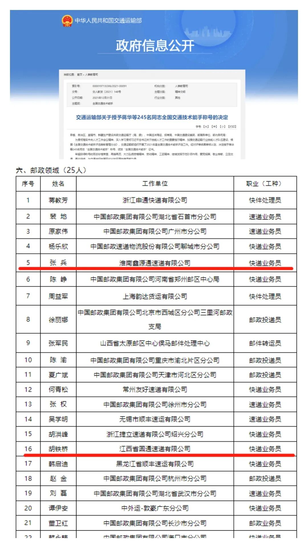 近日,交通运输部公布2021年度全国交通技术能手评审结果,其中,圆通南昌红角洲分公司快递小哥胡铁桥、圆通安徽淮南分公司快递小哥张兵均荣获“全国交通技术能手”荣誉称号。