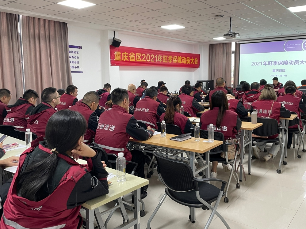10月16日,重庆区组织召开2021年旺季保障动员大会。首先,省区人员共同听取了总部2021年营运、网络、安全等板块的工作报告,了解了旺季期间总部的各项保障部署。接着,省区网管、营运、安保监察等部门就今年旺季保障要求在会上做了具体汇报,并与各分公司签订了《保障快递旺季服务承诺书》。另外,重庆区管委会会长还进行了动员发言,鼓舞分公司士气。