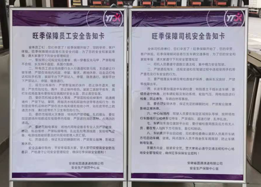 安全生产保障中心还向全网发布了《关于做好旺季安全保障工作的通知》、旺季保障员工安全告知卡、旺季保障司机安全告知卡等,要求各单位要打印张贴,并下发给场地工作人员,确保所有人员知晓安全生产主要事项。