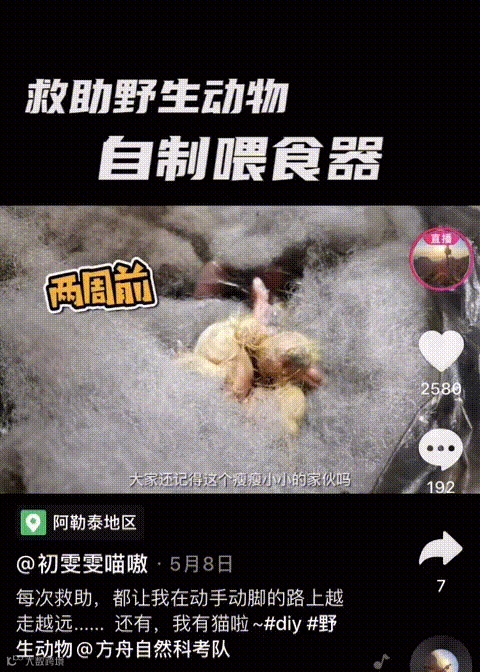 在初雯雯的抖音账号@初雯雯喵嗷 上,她还分享了很多野生动物的救助日常。作为常年进行救助保护的专业人员,其实也不无遗憾,误喝农药的蓑羽鹤在她身边停止了呼吸,还有争斗受伤的河狸宝宝在被救助23天后去世。雯雯说,现在自己已经能够学会控制住情绪,不再是先前那个一看到生死就哭鼻涕的小女孩了。