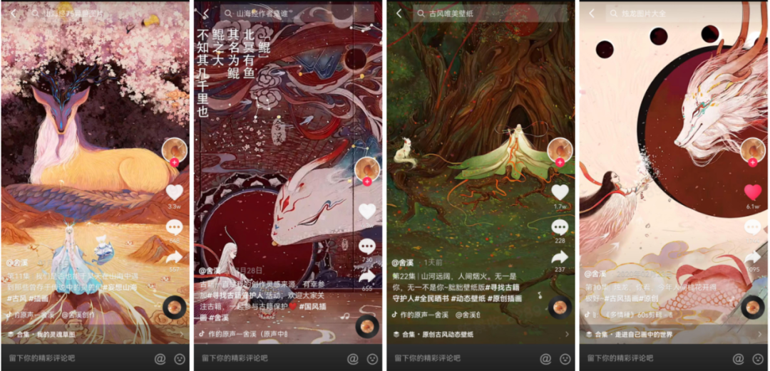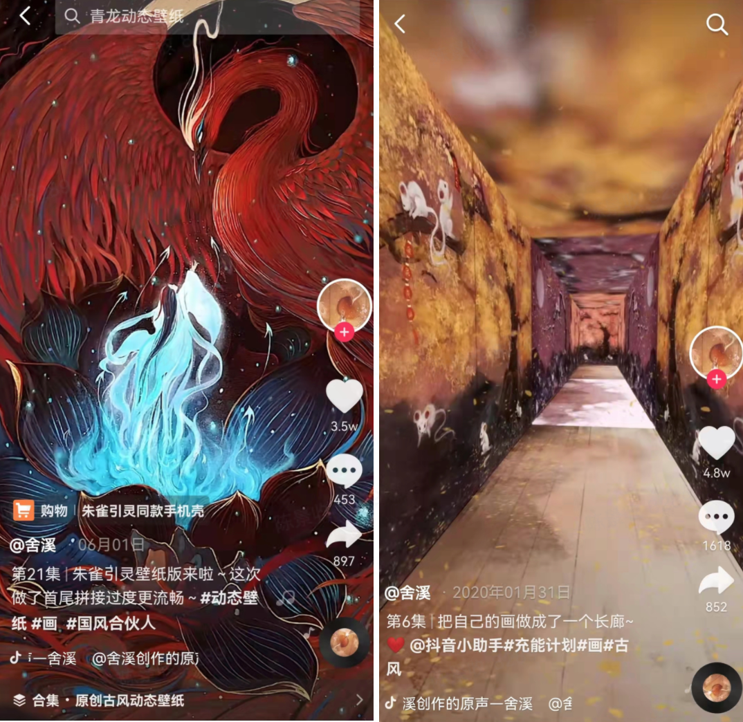 抖音特效的加持也让这些画作变得立体和丰满起来。很多时候,舍溪会在视频中加入3D视觉或者动态效果,于是那些神怪就能穿越千年时光向我们柔柔地招手;有时她将自己的画做成长廊,一秒穿越古今,走入画中世界。就连舍溪自己也忍不住说到“宅在家的时候,除了画画就是做视频。”