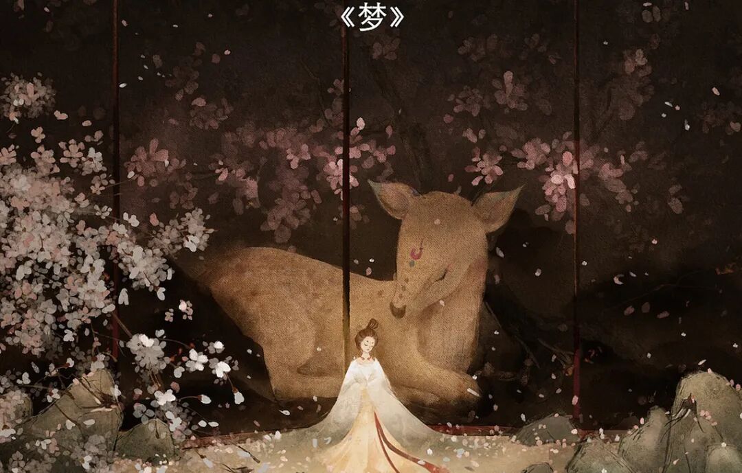 这在“境”系列创作中尤其明显。《梦》和《隐》两幅画中,人与兽都在花树下静静小憩,宁静而安详。这意境就像舍溪当初试着成为一名自由插画师时的迷茫无措,却在山海异兽的陪伴中找到了内心的平和与安宁。