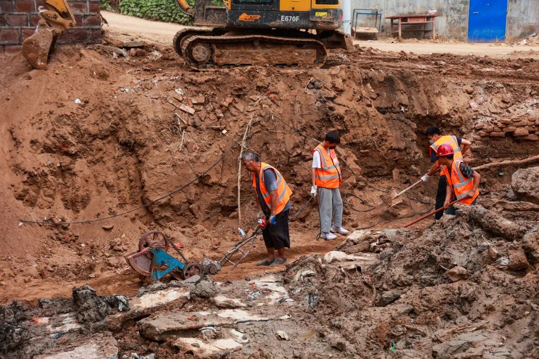 8月13日,巩义再次遭遇暴雨天气,学校刚刚打好的围墙地基被冲毁,倒灌的积水再次将埋好的管道全部冲开。