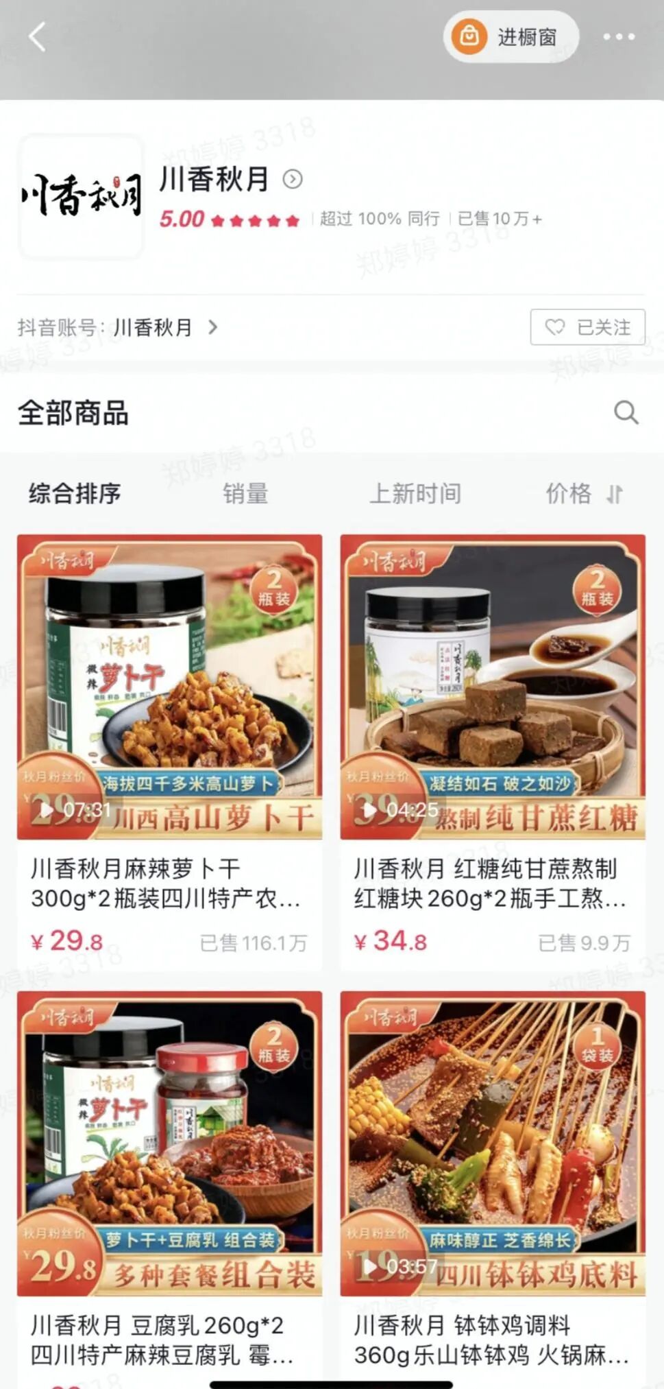 直到磨豆花的视频发出,一石激起千层浪。这一条视频,让川香秋月涨粉超过50万。她真正意识到,自己的坚持有了收获。如今,她已收获了上千万粉丝关注,还开始卖四川腐乳、辣酱、钵钵鸡调料等,随着在抖音电商越做越好,川香秋月招了很多附近村镇的村民,帮他们就业。