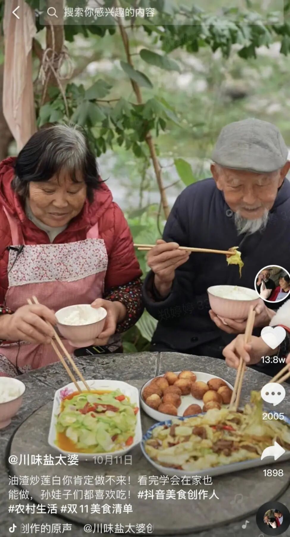 抖音号“川味盐太婆”的视频里,漆爷爷有些撒娇喊着“老太婆”三个字一出场,就意味着一顿美食将展现在大家面前。来自四川广元80多岁的漆爷爷和他的老伴阎婆婆,因制作美食视频被上千万粉丝关注。一对农村老人,能在网络备受关注,这样的“老来红”在以前是很难想象的。