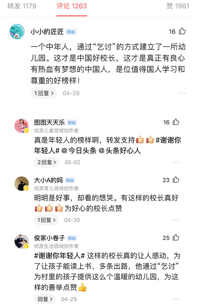 在政府和社会各界的大力帮助下,德胜幼儿园办得越来越好,也获得了很多关注。今日头条和头条寻人发起的#谢谢你年轻人#活动里,王龙羽被选为“头条好心人”,他的故事打动了很多网友,有人评论说,“他也许很穷,但他精神很富有”,也有网友想要捐钱捐物,尽一份力。