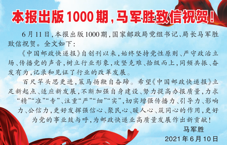 国家邮政局党组书记、局长马军胜发来贺信,鼓励《中国邮政快递报》立足新起点、适应新发展,不断加强自身建设、努力提高办报质量,力求“精”“准”“专”、注重“严”“细”“实”,切实增强传播力、引导力、影响力、公信力,更好发挥强信心、聚民心、暖人心、筑同心的作用,更好为党的事业鼓与呼,为邮政快递业高质量发展作出新贡献!