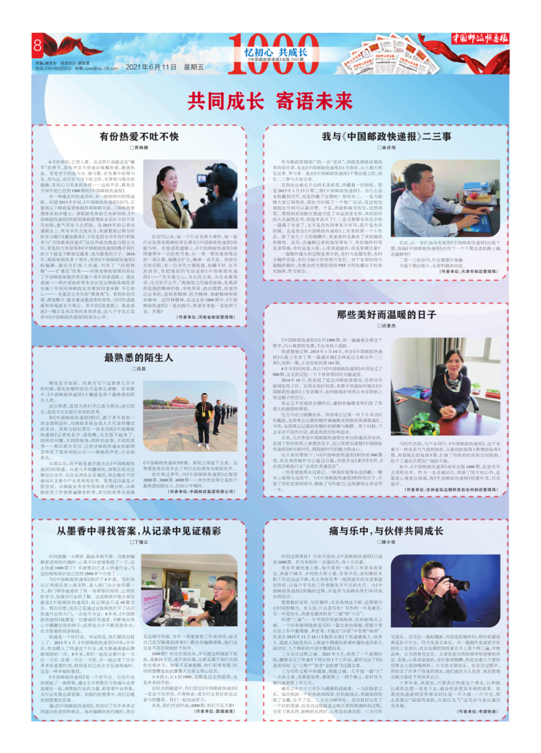 ——我们难忘,倾力支持报纸的你们。无论是“随手拍摄影大赛”,还是“炎炎夏日·暑你最美”,每一次主题征稿,稿件都纷至沓来。无论是给编辑部写一封邮件、提供一个新闻线索,还是探讨问题,你们的支持和热心都令人感动。8 年来,报纸与亲爱的读者同呼吸共命运,与行业发展同频共振,再塑流程、优化版式、改进文风……在自我迭代和不断进化中迎难而上。8 年来,《中国邮政快递报》斩获过“全国青年文明号”等名誉和中国经济新闻一等奖等各类奖项,军功章里有你们一半。