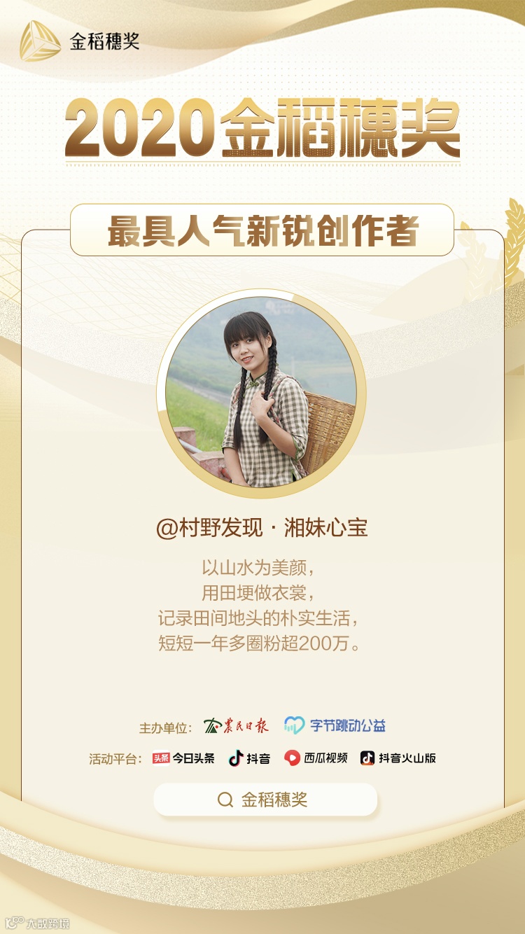 11月4日,2020金稻穗奖获奖名单公布。抖音火山版创作者“村野发现·湘妹心宝”获得了最具人气新锐创作者奖项。