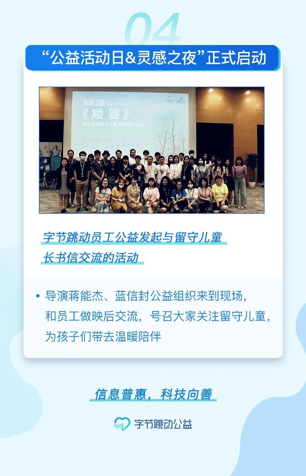 8月27日,“公益活动日&灵感之夜”正式启动。字节跳动员工公益发起与留守儿童长书信交流的活动。电影《矮婆》导演蒋能杰、蓝信封公益组织来到现场,和员工做映后交流,号召大家关注留守儿童,为孩子们带去温暖陪伴。