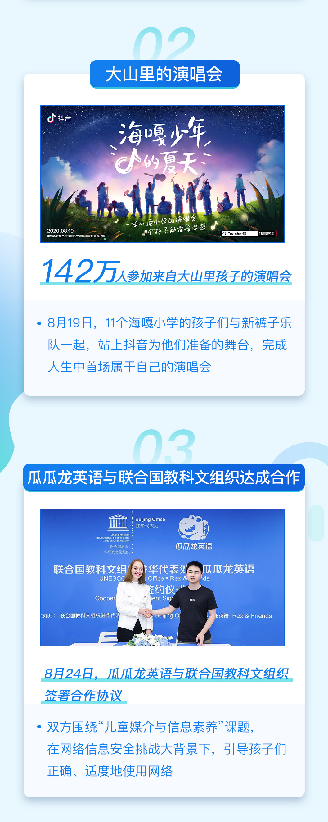 8月24日,瓜瓜龙英语与联合国教科文组织签署合作协议,双方围绕“儿童媒介与信息素养”课题,在网络信息安全挑战的大背景下,帮助孩子们提升媒介使用能力,引导他们正确、适度地使用网络。