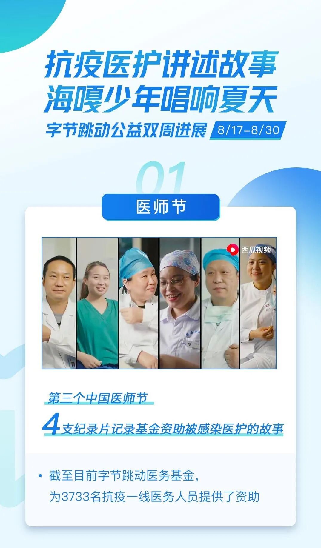 8月19日,在第三个中国医师节,4支纪录片记录了基金资助受感染医护的故事。截至目前,字节跳动医务基金已为3733名抗疫一线医务人员提供了资助。