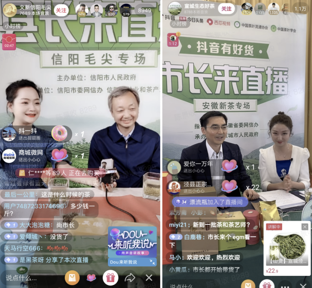 乡村胡子哥、老饭骨、刀小刀sama、雪茸堂、图爷说茶等多位抖音创作者也通过与市长、县长(区长)们连麦互动,助力各地特色茶叶销售。